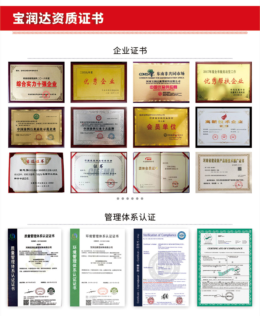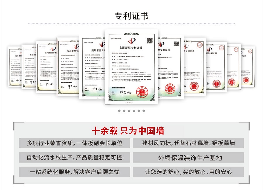 寶潤達(dá)在保溫裝飾一體板領(lǐng)域的優(yōu)勢,不僅僅只是建立在現(xiàn)代化的生產(chǎn)車間、先進(jìn)的制造工藝、卓越的產(chǎn)品性能上。寶潤達(dá)自1996年涉足外墻裝飾領(lǐng)域以來,積累了24年的行業(yè)經(jīng)驗,擁有一支行業(yè)高水準(zhǔn)的設(shè)計、安裝施工隊伍,真正具備集產(chǎn)品、設(shè)計、施工為一體,打造精品工程的能力。只要您給寶潤達(dá)參與的機(jī)會,我們就有十足的信心向您提供放心的系統(tǒng)化解決方案。